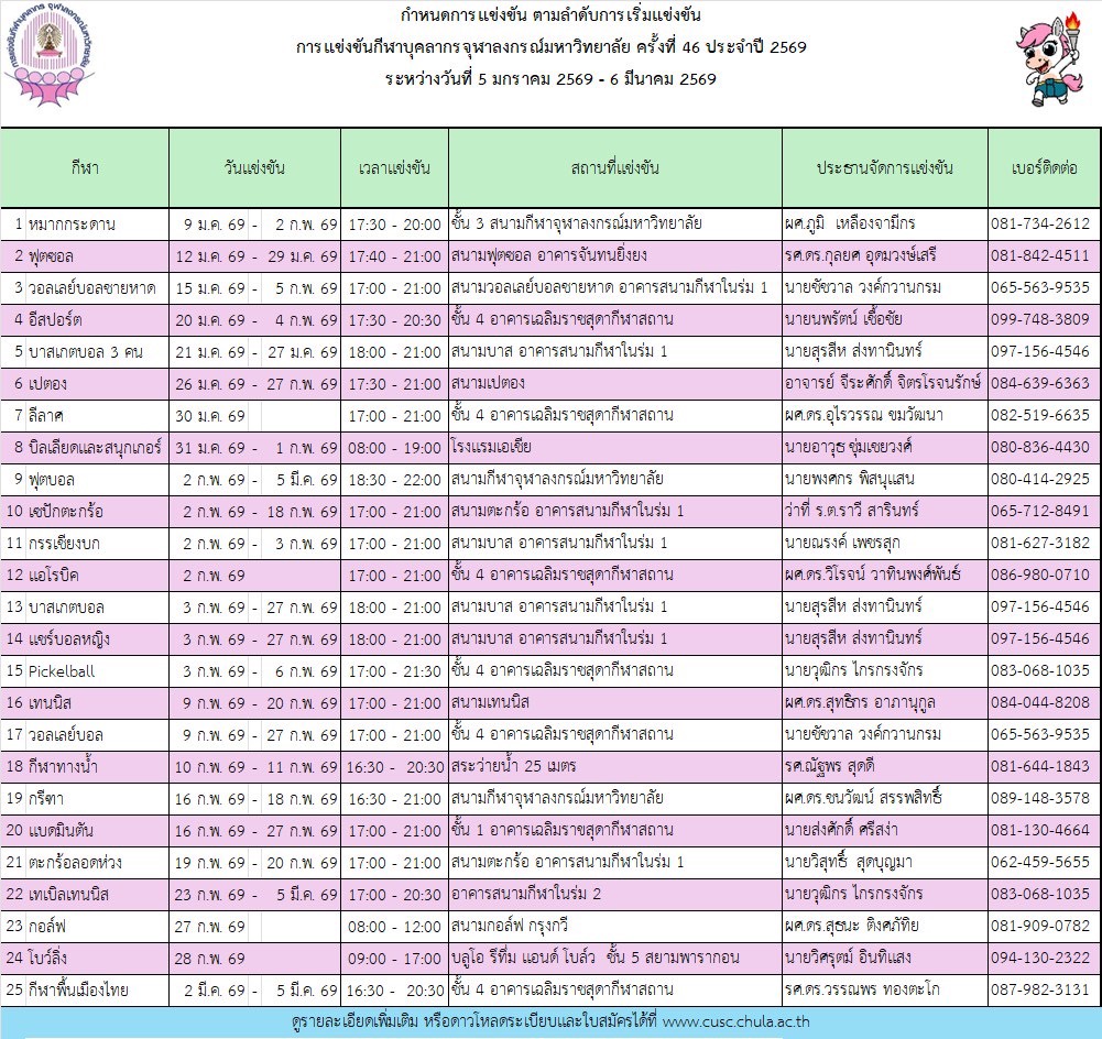 กำหนดการ การแข่งขันกีฬาบุคลากรจุฬาลงกรณ์มหาวิทยาลัย